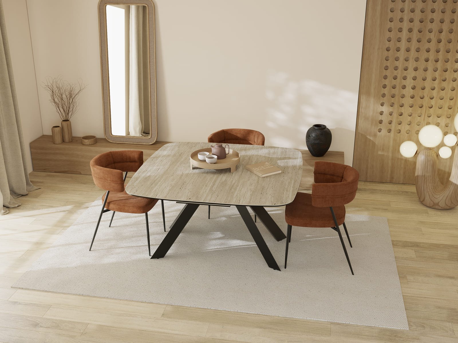 La chaise LONDRES séduit par son design minimaliste et son confort soigné. Son revêtement en tissu résistant et son piétement en acier noir mat en font un choix aussi esthétique que durable, idéal pour une salle à manger contemporaine